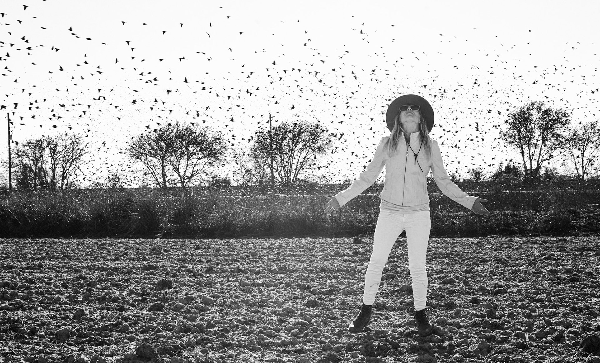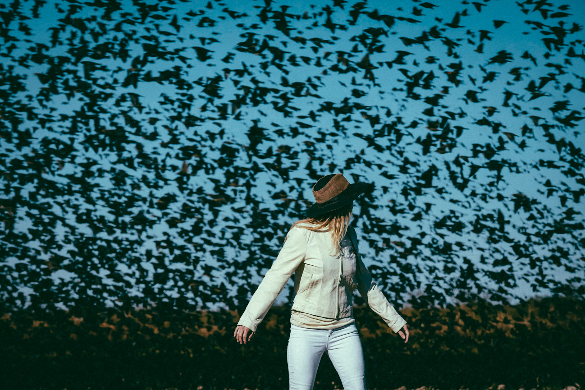 A few yards from the roadside, the yellow field turned black and appeared to undulate and shutter as if breathing uneasily. Then suddenly the black field appeared to rise up as a wall and come apart like a net swooping towards our car. After some moments (a rather embarrassing amount of time, if i am honest) we realized we were watching BIRDS - so many as to nearly blot out the sun.