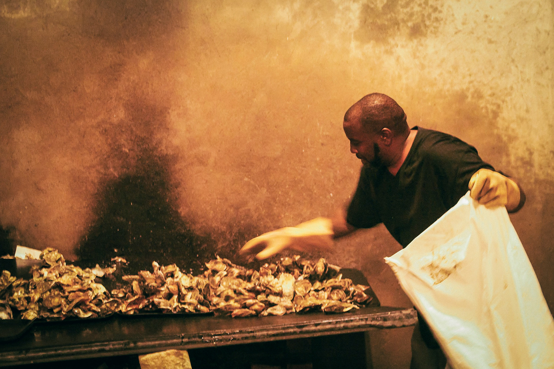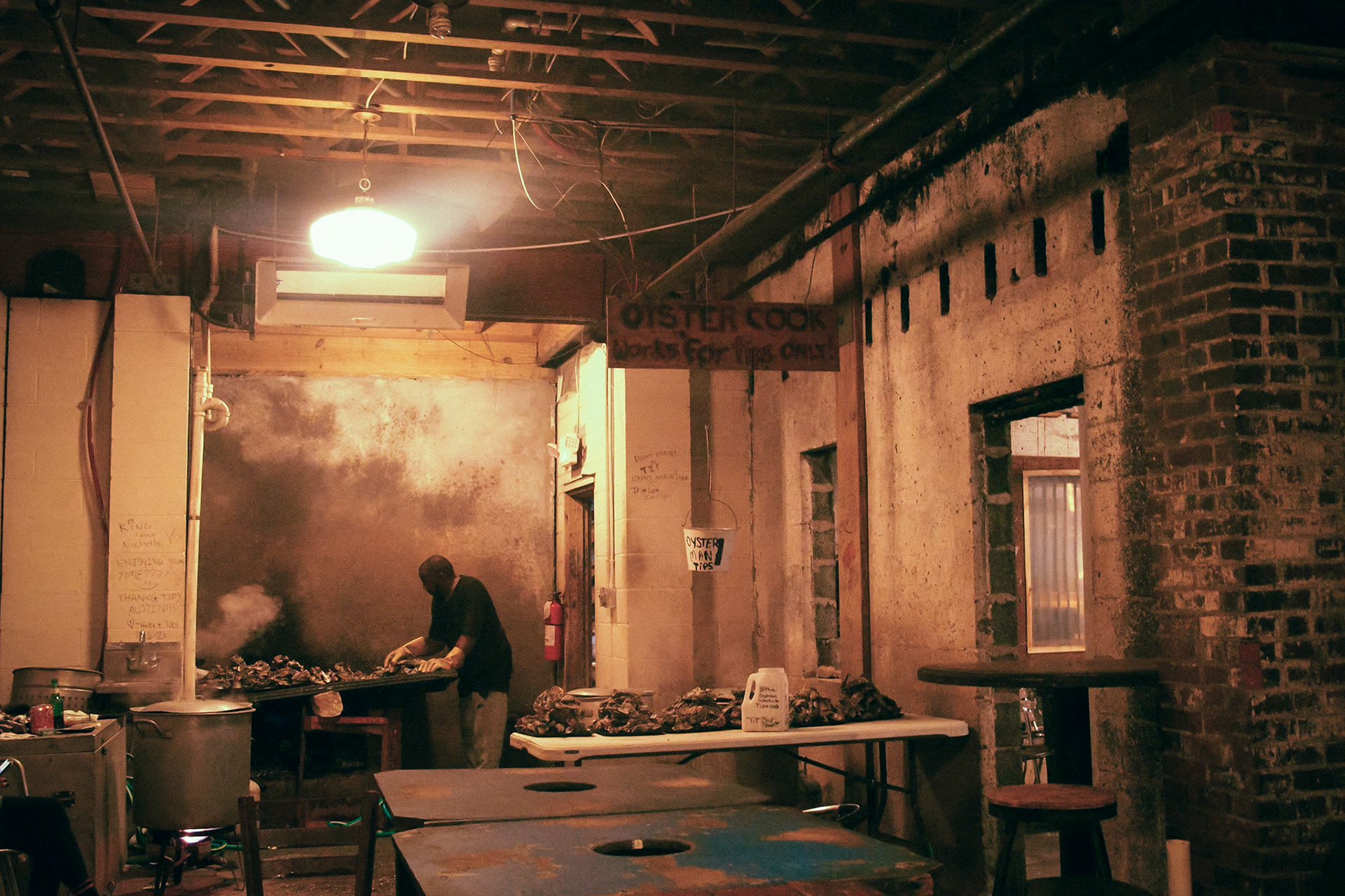 "an aging pile of cinder blocks and boards held up by layers of graffiti, with bivalves being cooked inside on some sacrificial altar"